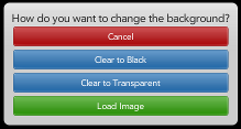 Background Dialog - The Background Dialog gives you options to change the background of the drawing canvas, i.e. what you are “drawing on”. You can have a transparent background, a black background, or a background made from an image on your TouchPad. See “Loading Images” below for information on loading images into Pixelism.