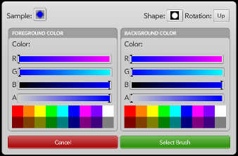 The middle of the dialog contains selectors for the Foreground and Background colors. The Foreground color is the color that replaces white in the shapes shown in the Shape Selector. The Background Color replaces black in the shape. Each color selector has sliders for the amount of Red, Green, and Blue in the color. The sliders will change color to demonstrate how they will affect the resulting color. Below the color sliders is an “Alpha Transparency” slider, which will affect how transparent the resulting color is. Below the sliders is a collection of color presets for commonly used colors.